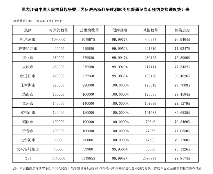 2025年11月4日黑龙江省中国人民抗日战争暨世界反法西斯战争胜利80周年普通纪念币预约兑换进度统计表