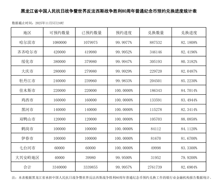 2025年11月5日黑龙江省中国人民抗日战争暨世界反法西斯战争胜利80周年普通纪念币预约兑换进度统计表