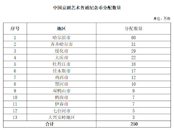 中国京剧艺术普通纪念币面额为5元,直径为30毫米,材质为黄铜合金,发行数量为6000万枚,黑龙江省分配数量为250万枚,各地区分配数量如下:
