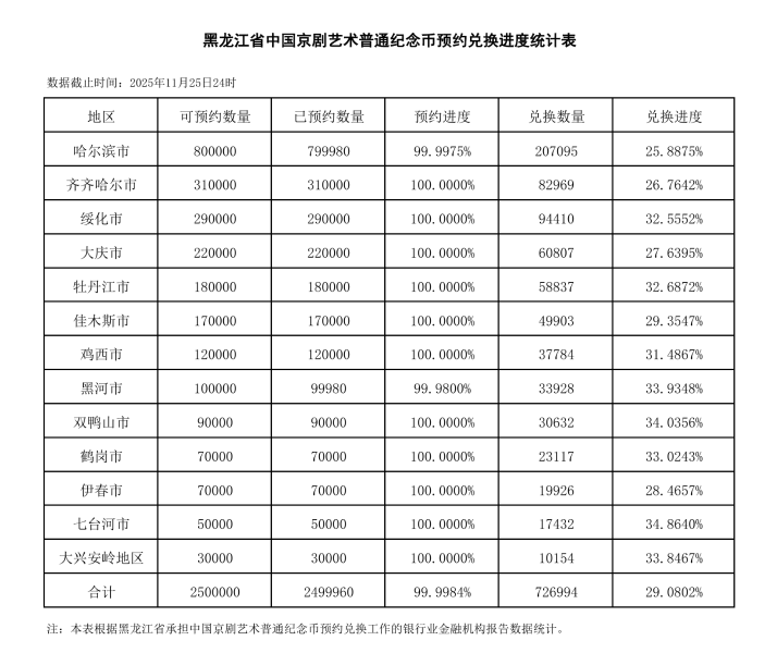 黑龙江省中国京剧艺术普通纪念币预约兑换进度统计表(2025年11月26日)